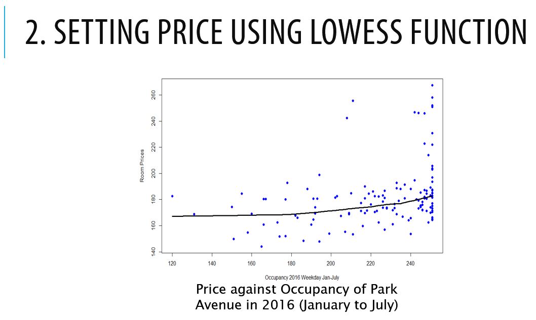 Using R, a lowess function (scatter plot smoothing tool) calculates and plot the average price of each occupancy. This line is fairly straight and can be used as a guideline for base price or ceiling price.